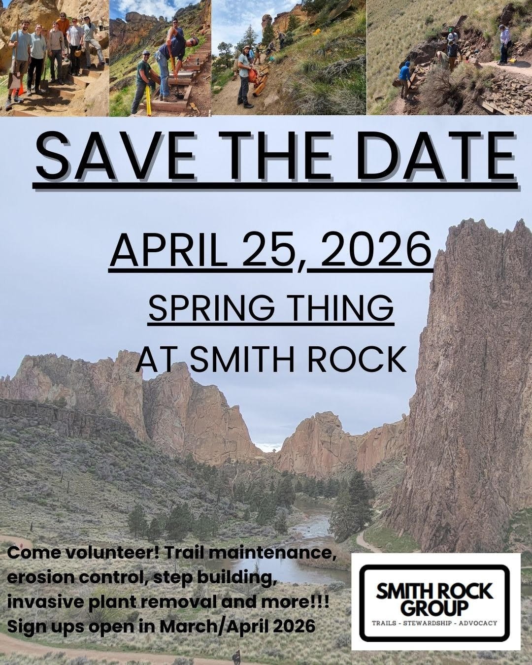The 2026 Spring Thing will take place at Smith Rock State Park on April 25, 2026.